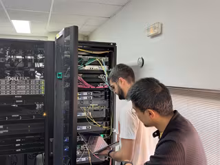Investigadores del grupo Mobilenet trabajando con equipamiento de PANDORA en la red 6G OPENRAN, en la E.T.S de Ingeniería de Telecomunicación de la Universidad de Málaga - VODAFONE