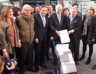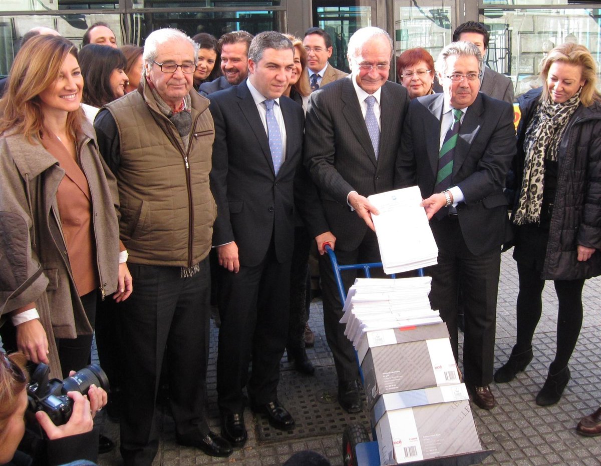 El presidente del Partido Popular de Andalucía (PP-A), Juan Ignacio Zoido, junto con el alcalde de Málaga, Francisco de la Torre, y el líder de los 'populares' malagueños, Elías Bendodo, han entregado en la mañana de este lunes en la sede del Gobierno andaluz en la capital un total de 50.122 firmas a favor del metro soterrado a su paso por la Alameda Principal.