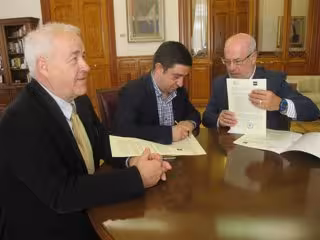 El presidente de la Administración provincial, Francisco Reyes, y el director de este centro educativo, Andrés Medina, han firmado el convenio de colaboración en el que se plasma la aportación de la Diputación de 22.500 euros que se traducen en 150 becas para 150 alumnos.
