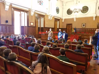 El presidente de la Diputación jiennense, Francisco Reyes, acompañado por el diputado de Servicios Municipales, José Luis Hidalgo, ha recibido en el Salón de Plenos del Palacio Provincial a un grupo de escolares y profesores del Colegio La Purísima de la ciudad de Jaén.