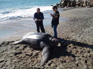 Efectivos del Programa de Defensa de la Fauna Marina (Promar) han atendido en una playa de Adra (Almería) a un ejemplar de dos metros de tortuga laúd --'Dermochelys coriacea'-- después de que apareciera varada y muerta aunque sin signos externos que evidencien alguna causa de muerte, por lo que ha sido trasladada para practicarle la necrópsia.