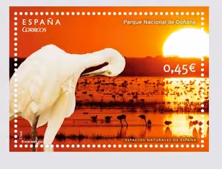 Según informó Correos en una nota, la imagen del sello dedicado al Parque Nacional de Doñana es un grupo de diferentes especies de aves alimentándose en una marisma al atardecer, destacando en primer plano un ejemplar de garceta común (Egretta garzetta).