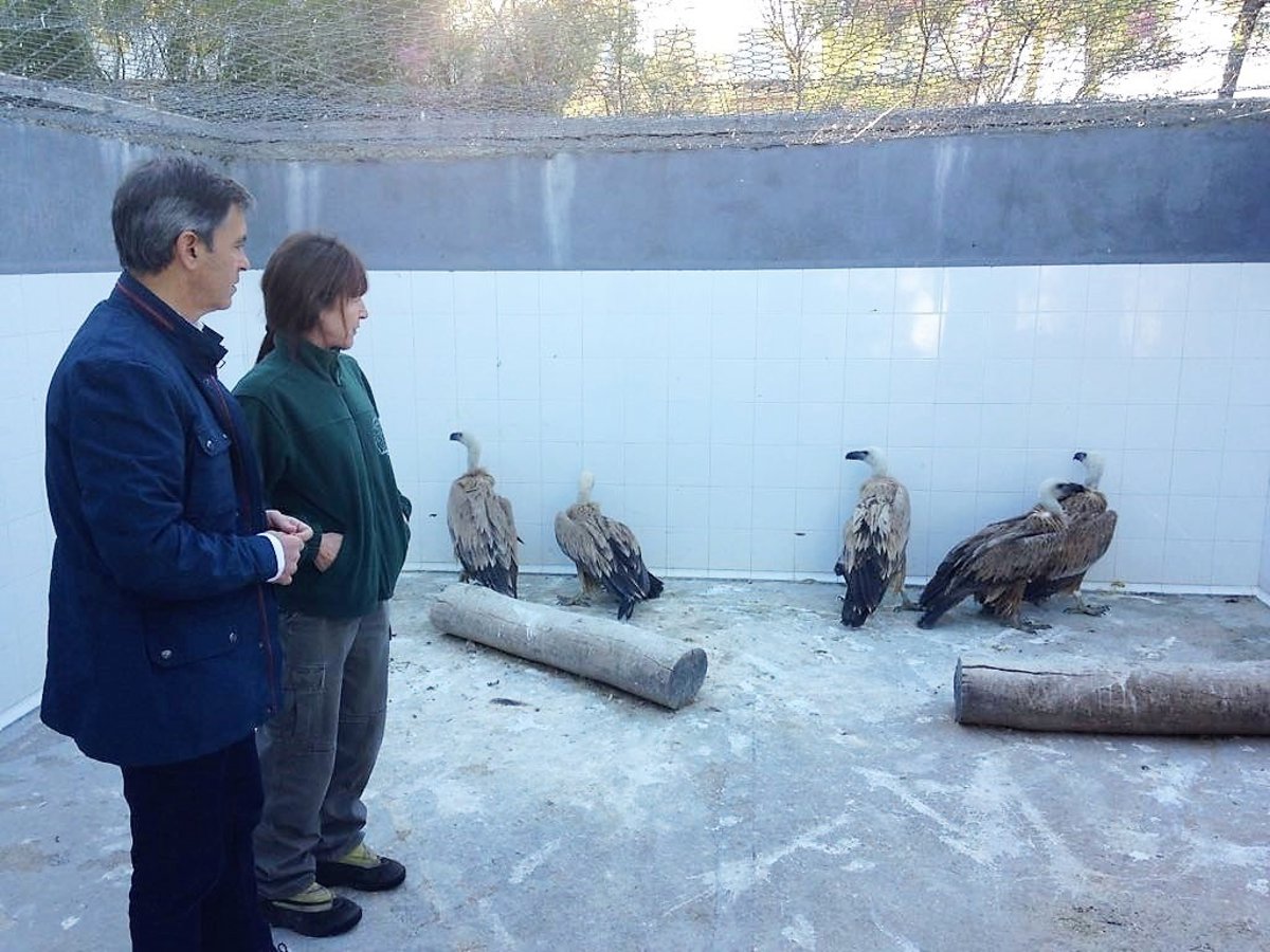 El delegado de Medio Ambiente y Ordenación del Territorio de la Junta en Cádiz, Ángel Acuña, ha visitado el Centro de Recuperación de Especie Amenazadas (CREA) 'Dunas de San Antón' junto a su equipo técnico para conocer la situación de los cinco ejemplares de buitre leonado que permanecían en estas instalaciones a la espera de ser cedidos al zoológico francés Bioparc, ubicado en la localidad de Doué la Fontaine.