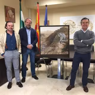 El delegado de Medio Ambiente y Ordenación del Territorio de la Junta, Francisco de Paula Algar, acompañado por el presidente de la junta rectora del Parque Natural Sierra de Hornachuelos, Alfonso García-Ferrer, ha presentado la obra del pintor Fernando García Herrera con la que se reconocerá a la persona galardonada con el Premio Moratalla, que concede el citado parque y que se entregará el próximo 10 de mayo.