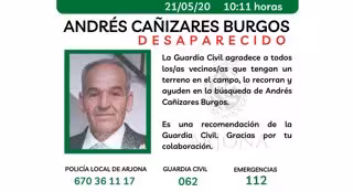 Unas 150 personas, entre efectivos de la Guardia Civil, Policía Local, Protección Civil y voluntarios, conforman el dispositivo que desde las 7,00 horas han retomado las labores de búsqueda en Arjona (Jaén) de Andrés Cañizares, de 68 años, desaparecido desde este miércoles cuando salió a dar un paseo por el campo.