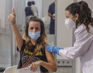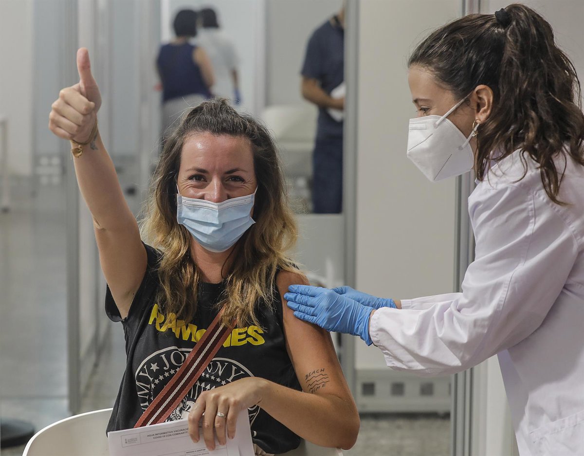 Una joven sonríe y saluda mientras recibe la vacuna contra el Covid-19 a una joven. - Rober Solsona - Europa Press
