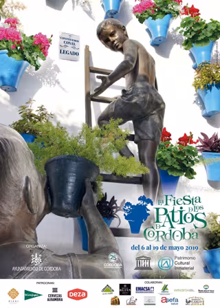 Precisamente, el cartel de 2019 retrata la escultura situada en el Alcázar Viejo como homenaje al relevo generacional en los Patios e incluye, como recurso gráfico, un azulejo con el lema 'Continuemos con el legado'.