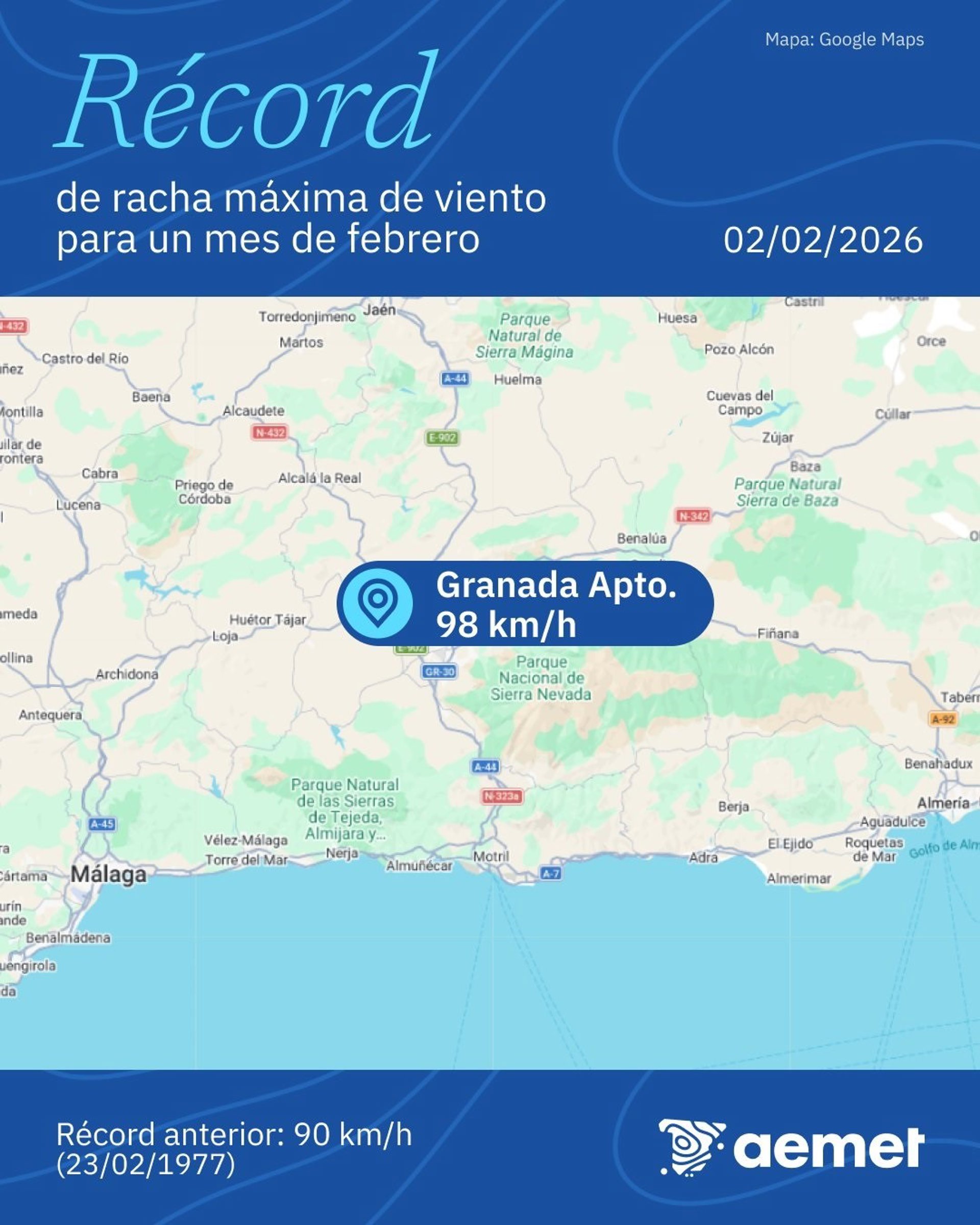 El aeropuerto de Granada bate récord en un mes de febrero con rachas de 98 kilómetros por hora. - AEMET