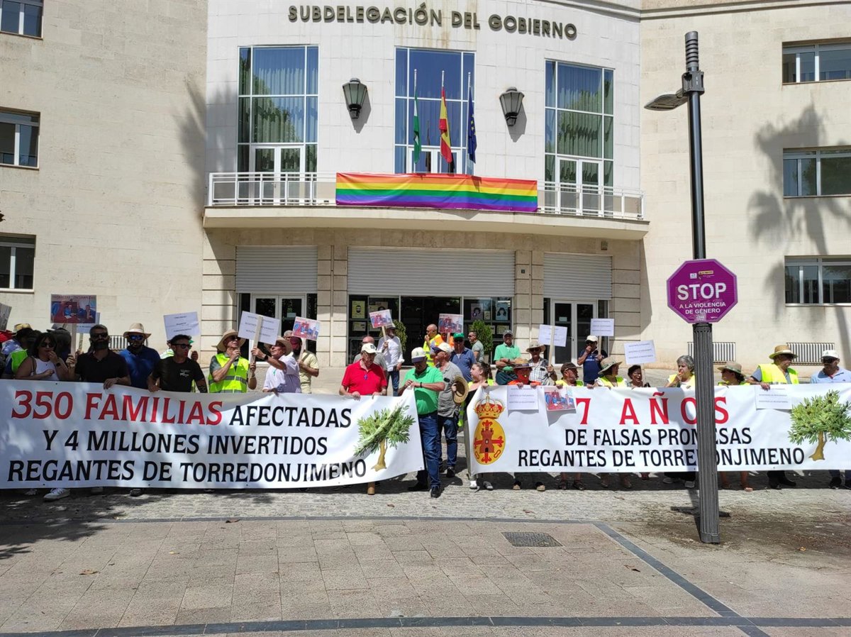 Agricultores convocados por la Comunidad de Regantes de Torredonjimeno (Jaén) se han manifestado ante la Subdelegación del Gobierno y la sede de la Confederación Hidrográfica del Guadalquivir (CGH) para reclamar la autorización que les permita regar después de siete años de espera.