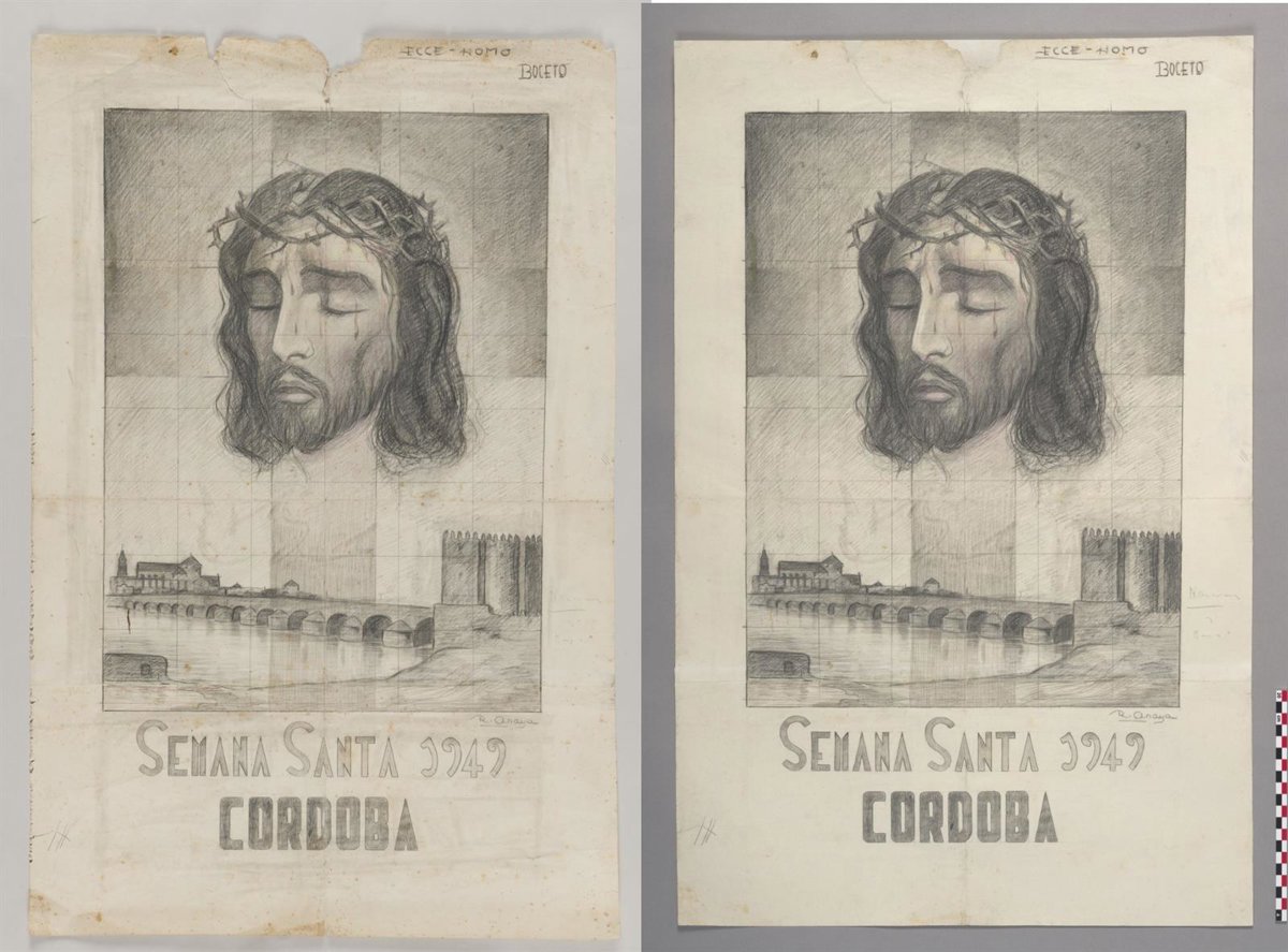 Archivo - El boceto original del cartel anunciador de la Semana Santa de Córdoba de 1949, obra del cartelista cordobés Ricardo Anaya Gómez, antes y después de su restauración. - A. EUGENIO FERNÁNDEZ RUIZ - Archivo