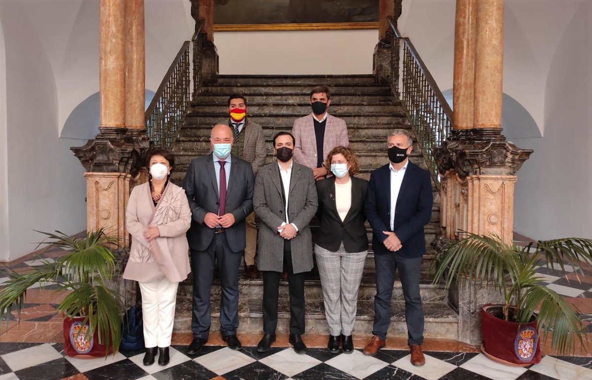 El ministro de Consumo, Alberto Garzón (centro), junto a representantes del Gobierno en Córdoba y de la Diputación provincial, antes de inaugurar las jornadas 'Jóvenes de azar. Apostando por la salud'. - EUROPA PRESS