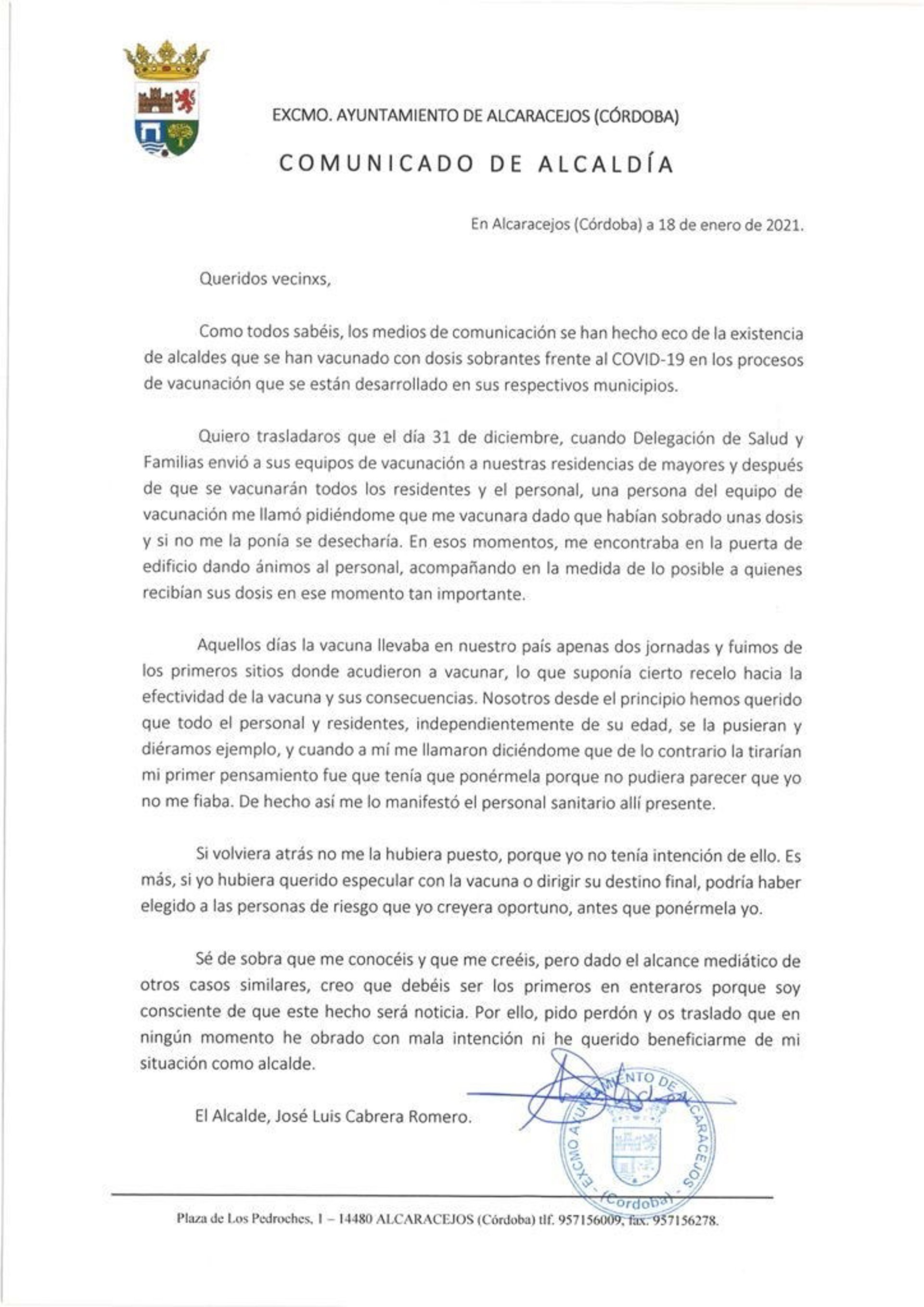 Carta del alcalde de Alcaracejos a sus vecinos pidiendo perdón por haberse vacunado contra el Covid. - AYUNTAMIENTO DE ALCARACEJOS