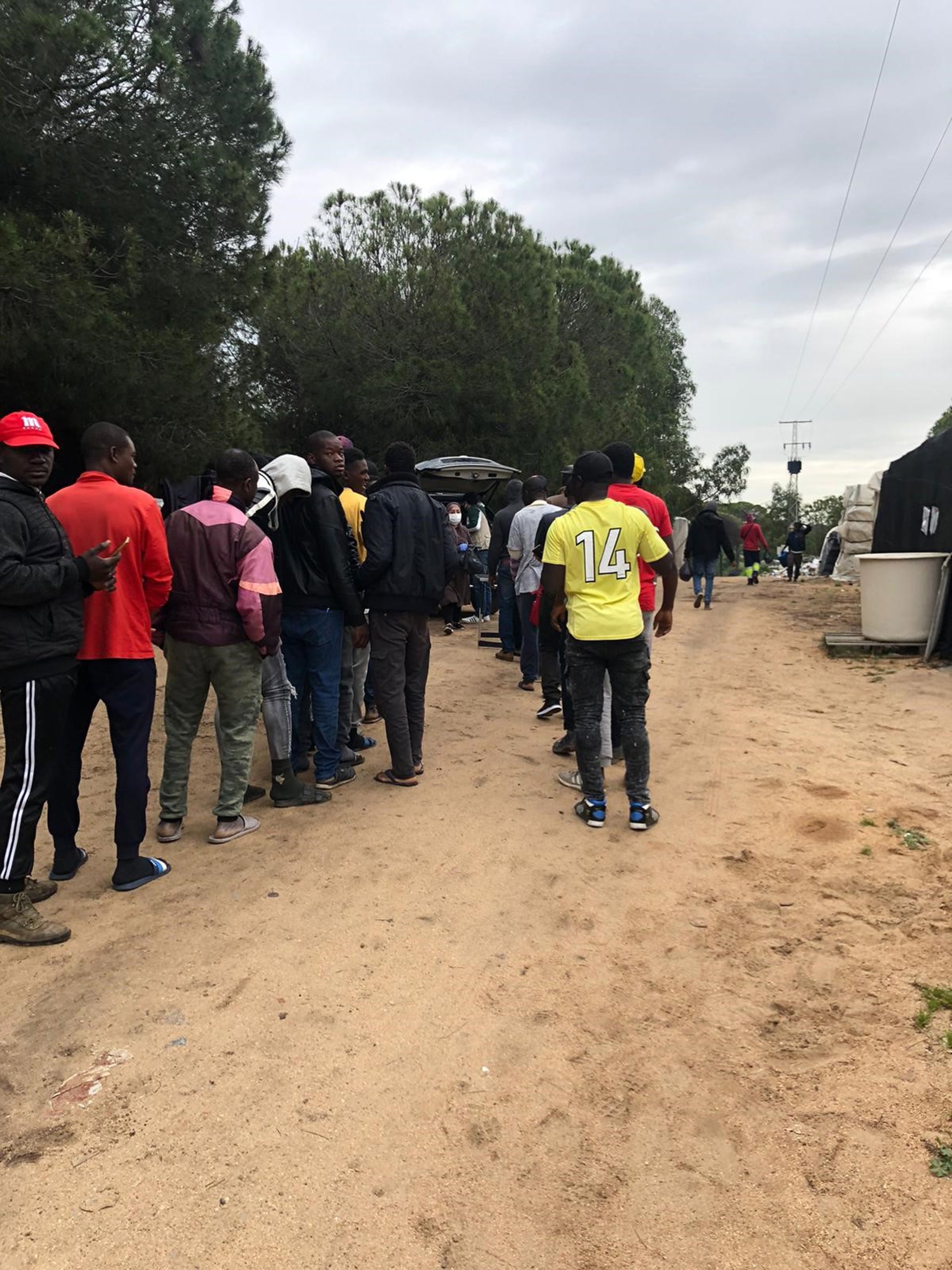 Imagen del reparto de kits higiénicos entre la población migrante por Huelva Acoge . - HUELVA ACOGE