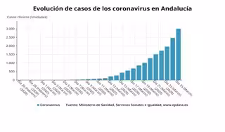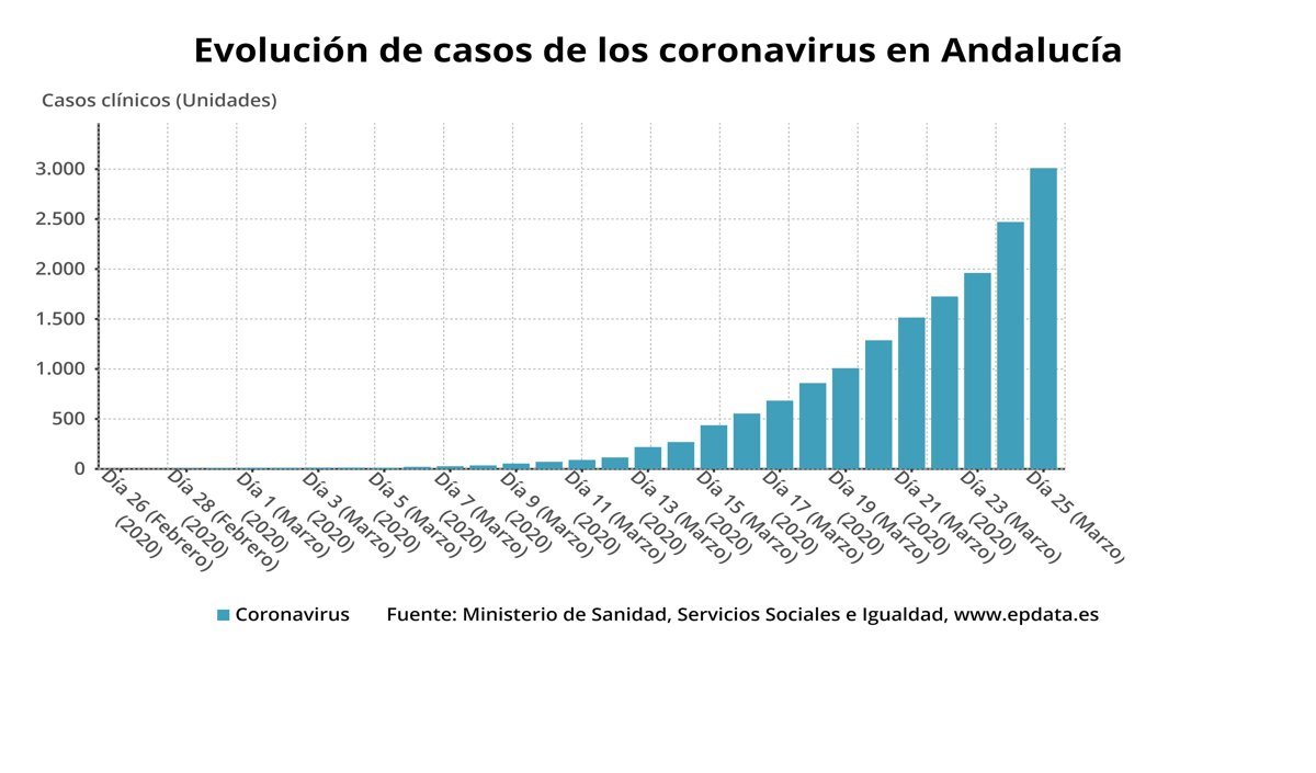 Andalucía alcanza ya los 3.010 afectados por coronavirus, 539 más que este martes, un 22% más en 24 horas, según los datos consolidados a las 21,00 horas de ayer aportados por el Ministerio de Sanidad en el balance actualizado a las 11,30 horas, que señala que los fallecidos en la comunidad autónoma ascienden a 113, 26 más.