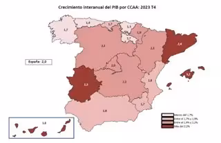 En términos interanuales, Andalucía ha registrado un aumento del PIB en 2023 del 1,8%, lo que supone 0,2 puntos por debajo del dato nacional (2%). Además, apunta la autoridad fiscal, se observa que Canarias es la región que presenta el mayor crecimiento del PIB, seguida de Illes Balears, con incrementos del 3,8% y 3,2%, respectivamente, superiores al crecimiento del conjunto de España (2%). Por el contrario, el incremento más débil se registra en el País Vasco, con una tasa de variación del 1,3%, seguido del Principado de Asturias (1,4%).