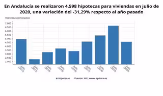 Andalucía ha liderado en julio la constitución de hipotecas sobre viviendas con 4.598 operaciones, cifra que representa un incremento mensual del 2,4% y una caída interanual del 31,3%, un descenso superior en 8,3 puntos a la media nacional, que ha sido de un 23,0%, según los datos ofrecidos este lunes por el Instituto Nacional de Estadística (INE).