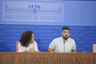 El parlamentario de Por Andalucía y miembro de Podemos, José Manuel Gómez Jurado, este miércoles en rueda de prensa junto a la portavoz del grupo, Inmaculada Nieto. - JOAQUÍN CORCHERO/EUROPA PRESS