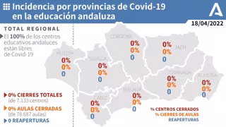 Asimismo, a fecha 18 de abril no ha registrado la reapertura de ningún aula en los centros educativos de la comunidad autónoma andaluza.