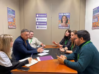 El candidato de Podemos a la Presidencia de la Junta y diputado autonómico de Por Andalucía, Juan Antonio Delgado (izq.), mantiene una reunión con representantes sindicales de los trabajadores del servicio de emergencias 112. (Foto de archivo). - PODEMOS