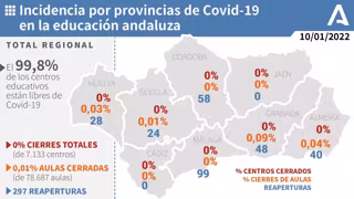 A fecha 10 de enero, día del inicio del segundo trimestre del curso escolar 2021/2022, se han registrado 297 reaperturas de aulas. Así, Almería suma 40, Córdoba 58, Granada 48, Huelva 28, Málaga 99 y Sevilla 24. Cádiz y Jaén no suman ninguna reapertura.