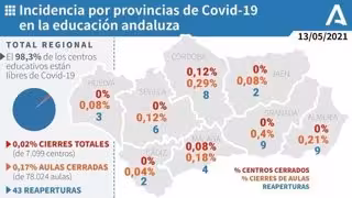 Según precisan los datos facilitados por la Consejería de Salud y Familias, a fecha del jueves 13 de mayo, el colegio cerrado representa el 0,02% de los 7.099 centros, mientras que las 136 aulas afectadas son el 0,17% de las 78.024 que hay en la comunidad, toda vez que el 98,3% de los 7.099 centros educativos andaluces están libres de coronavirus.