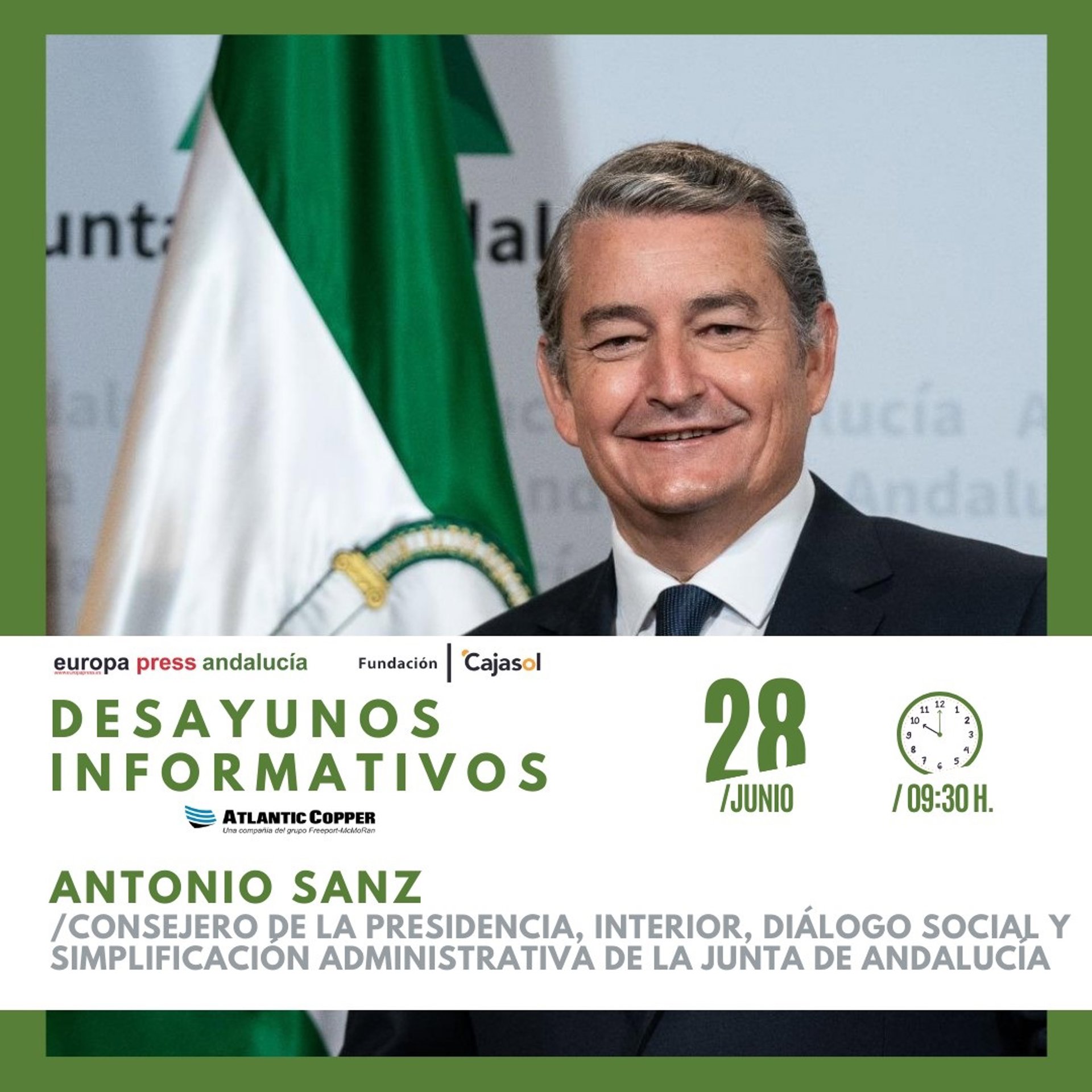 El consejero de la Presidencia, Interior, Diálogo Social y Simplificación Administrativa de la Junta de Andalucía, Antonio Sanz, participa este viernes, 28 de junio, en Sevilla en los desayunos informativos de Europa Press Andalucía en colaboración con la Fundación Cajasol y con el patrocinio de Atlantic Copper.