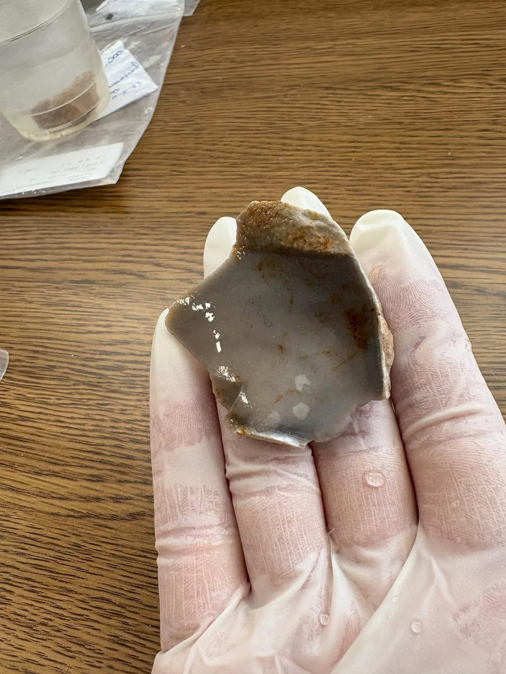 La investigadora Mayra Guajardo Sondón ha sido la primera en coger la lasca de sílex tras su hallazgo - UGR