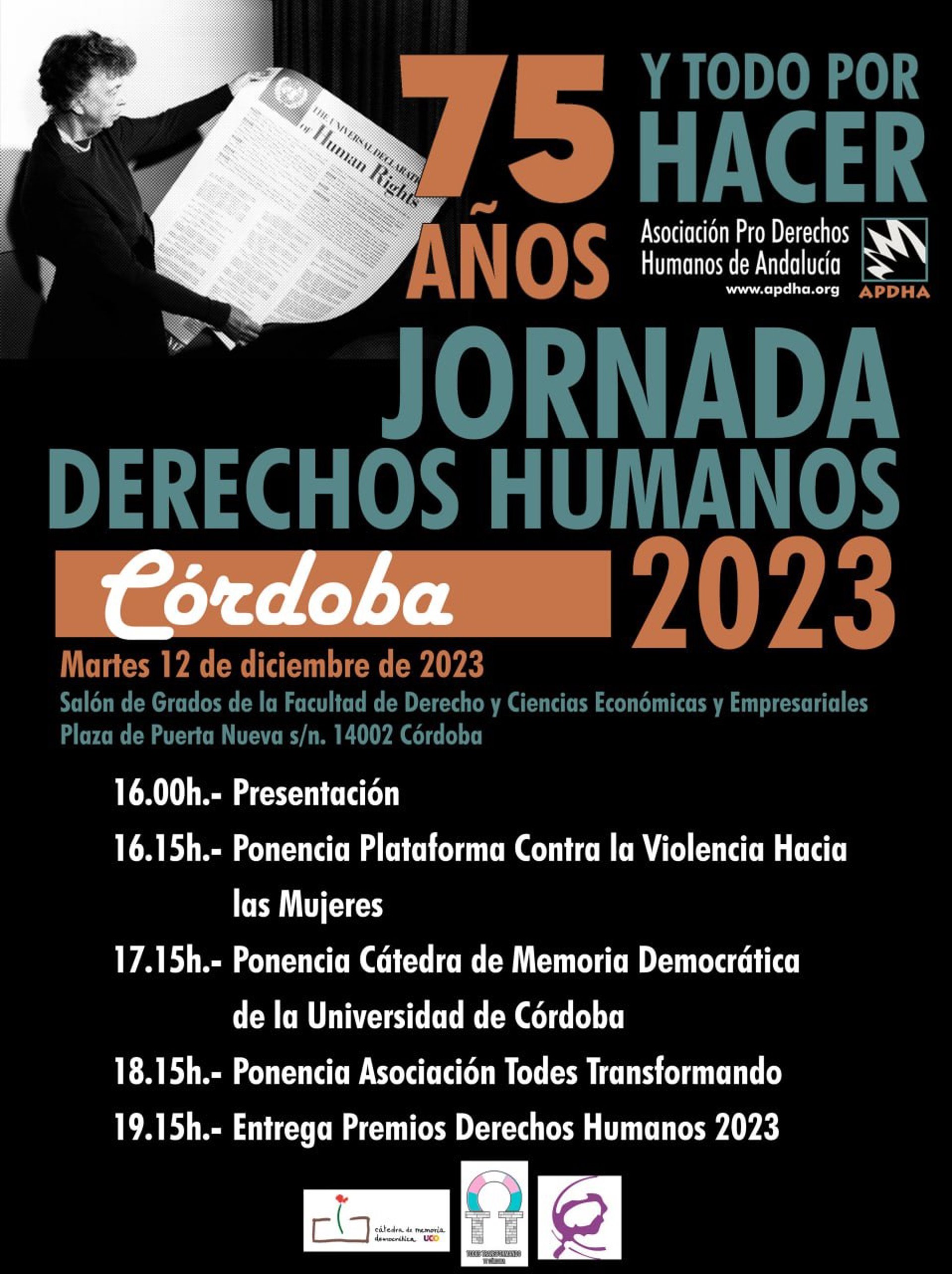 Con motivo del Día Internacional de los Derechos Humanos que se conmemora el 10 de diciembre, la Delegación en Córdoba de la Asociación Pro Derechos Humanos de Andalucía (Apdha) reconoce, como cada año, con el Premio de Derechos Humanos la labor de entidades y personas de la provincia en defensa de los derechos fundamentales, galardón que este año ha recaído en la Plataforma Cordobesa Contra la Violencia hacia las Mujeres y en el abogado laboralista y profesor universitario Alejandro Ruiz Huerta Carbonell.