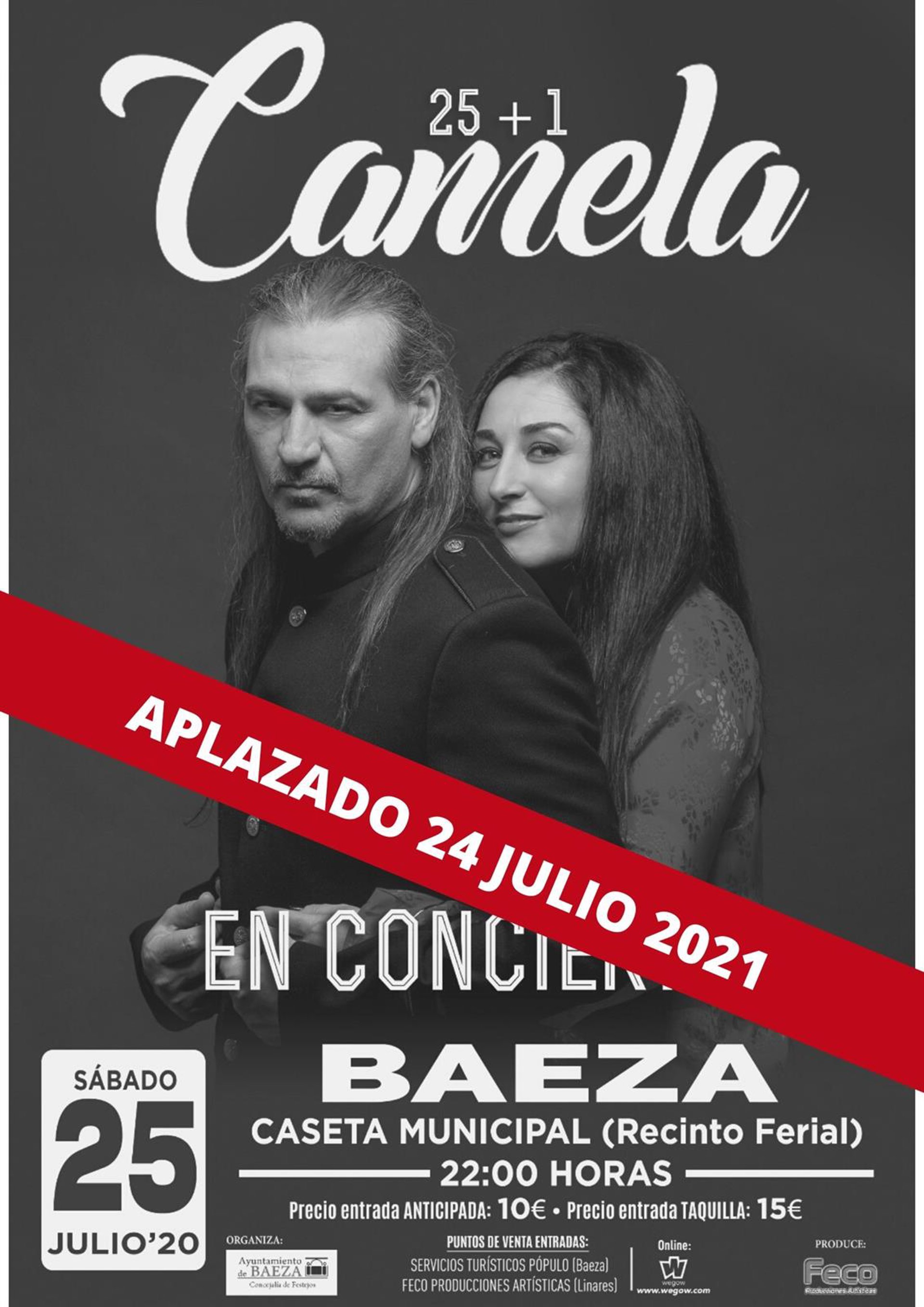 El Ayuntamiento de Baeza ha anunciado que, debido a la situación de alerta sanitaria producida por el Covid-19 y siguiendo las recomendaciones de la Junta de Andalucía, se aplaza hasta el año que viene el concierto del grupo musical Camela, previsto para el 25 de julio en el Recinto Ferial dentro de las actividades del Pórtico de Feria.