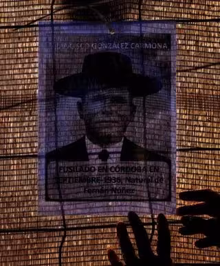 Imagen de un represaliado cordobés colocada en las vallas que rodean los trabajos de exhumación de fosas en Córdoba. - AREMEHISA