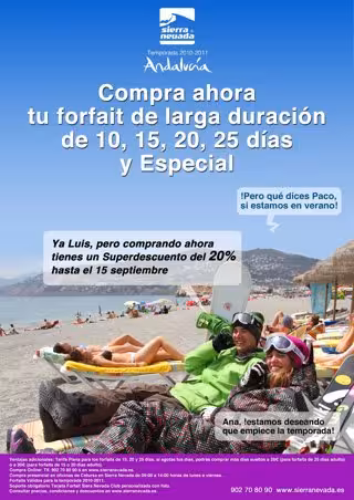 Cetursa Sierra Nevada pone en marcha este jueves la campaña de venta de la temporada de esquí 2010-2011, con importantes descuentos escalonados en función de la fecha de compra. Se trata de la primera vez que la empresa que gestiona el espacio invernal inicia la venta anticipada en pleno verano.