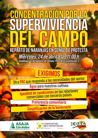 Las patronales agrarias Asaja, COAG y Cooperativas Agro-alimentarias han convocado para el próximo miércoles 24 de abril una concentración, ante la Subdelegación del Gobierno central en Córdoba, por la "supervivencia del campo", y con un "reparto de naranjas en señal de protesta".