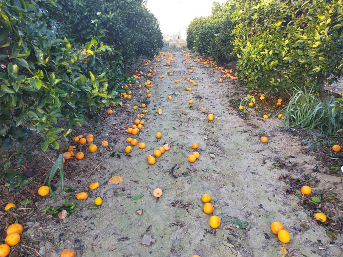 Por otro lado, el sector de los cítricos también se está viendo gravemente afectado. La caída de fruta al suelo por lluvias y viento "supone una disminución mínima del 30 al 40% de la cosecha". En variedades más tempranas, como Salustiana o Lane Late, se estima que "hasta el 50% de la producción se encuentra en el suelo, mientras que en las variedades más tardías, las pérdidas rondan el 30%".