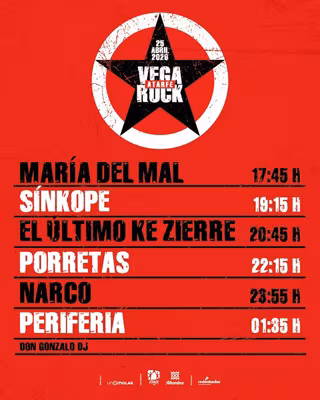 La propuesta musical arrancará a las 17,45 horas con María del Mal, dando paso al rock de Sínkope (19,15 horas) y al punk de El Último Ke Zierre (20,45 horas). La noche subirá de voltaje con los himnos de Porretas (22,15 horas), la embestida de Narco (23,55 horas) y la energía de Periferia (01,35 horas), para terminar de quemar las naves con el cierre de Don Gonzalo DJ.