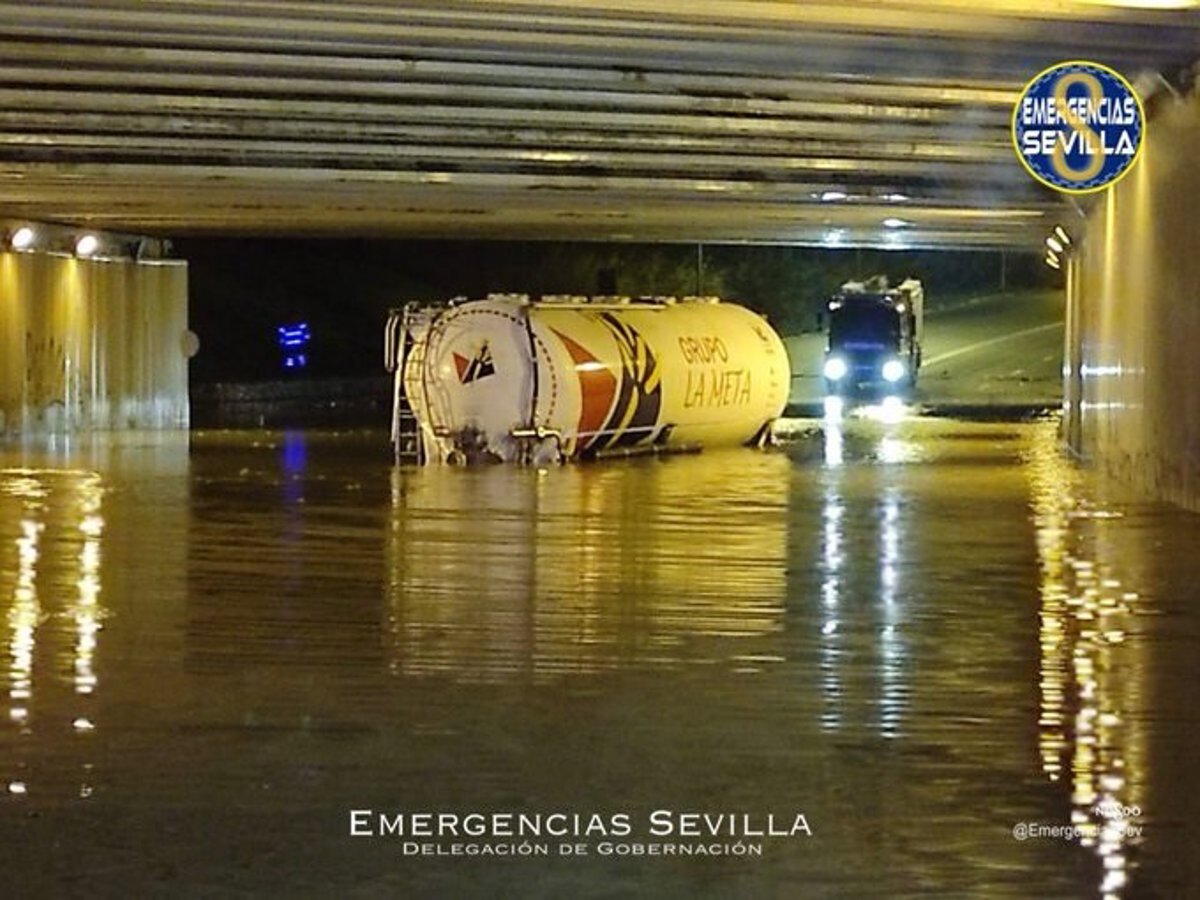 Camión detenido por la lluvia en un paso inferior anegado en Sevilla capital - EMERGENCIAS SEVILLA
