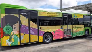 Los primeros autobuses incorporan publicidad sobre la fiestas y feria del mes de mayo y sobre el uso de la tarjeta de Aucorsa como medio de pago durante todo el año y especialmente durante los días de feria.