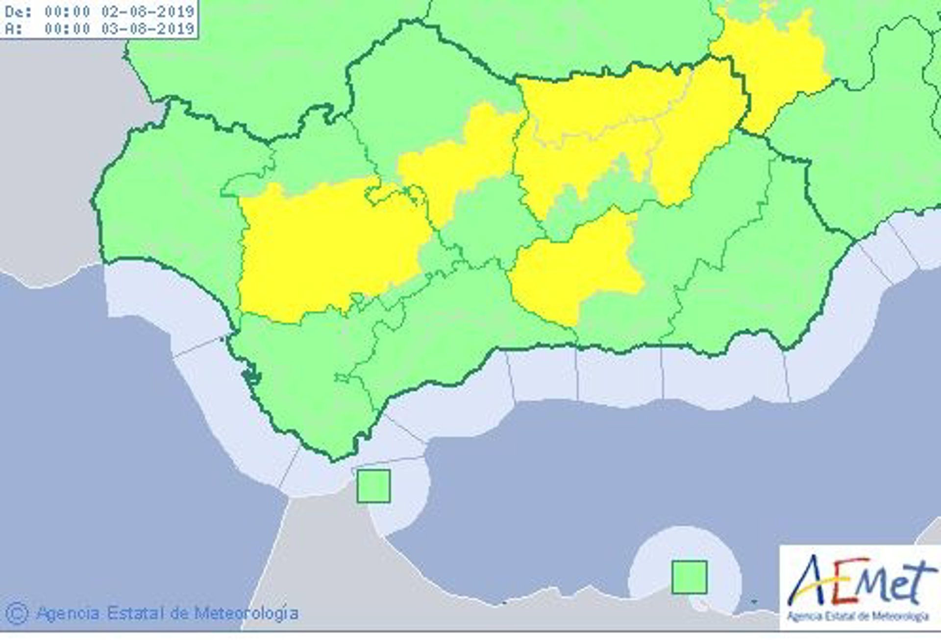 Aviso amarillo en varias provincias andaluzas vigente el viernes 2 de agosto de 2019 - AEMET