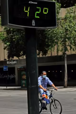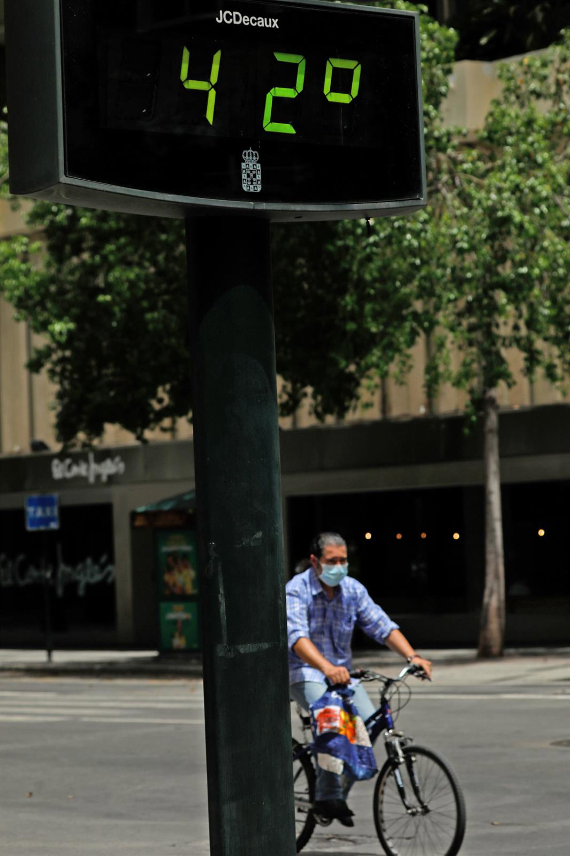 Un hombre pasea en bicicleta junto un termómetro que marca 42 - Edu Botella - Europa Press