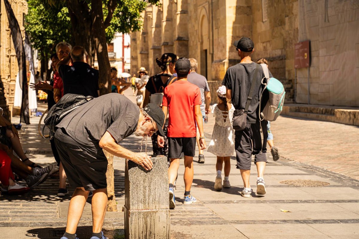 Archivo - Turistas se refrescan con agua para hacer frente a las altas temperaturas registradas en la capital cordobesa, a 19 de agosto de 2024 en Córdoba (Andalucía, España). - Guillermo Morales - Europa Press - Archivo