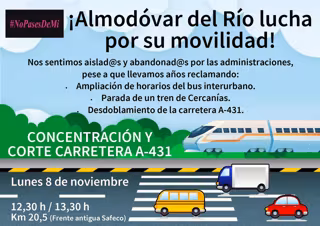 El Ayuntamiento de Almodóvar del Río (Córdoba), gobernado por IU, y la plataforma '#Nopasesdemí', han trasladado al próximo lunes 8 de noviembre el corte de la carretera A-431 que habían convocado inicialmente para este miércoles, en protesta por la "nula apuesta" que se hace en los Presupuestos Generales del Estado (PGE) para 2022 respecto a la puesta en marcha del Cercanías del Valle del Guadalquivir cordobés.