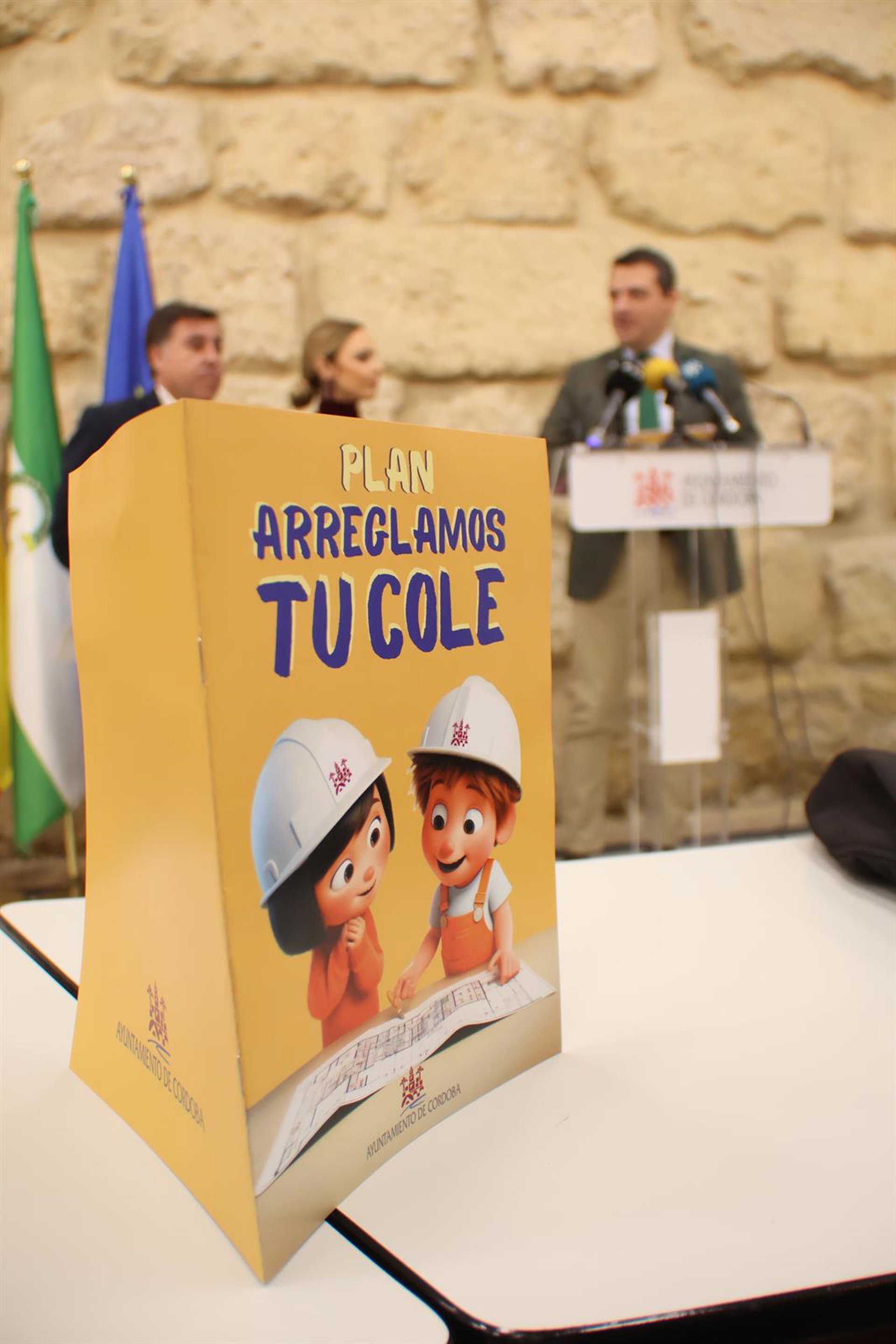El alcalde de Córdoba, José María Bellido, el delegado de Infraestructuras, Miguel Ruiz Madruga, y la delegada de Educación, Narci Ruiz, han presentado este lunes la primera fase del plan 'Arreglamos tu Cole' de mejora de los más de 50 centros escolares en edificios de titularidad municipal en la capital, en la que se actuará en 13 colegios con 1,8 millones de euros.