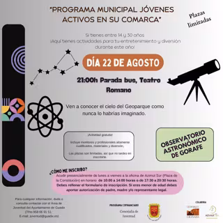 La Concejalía de Juventud del Ayuntamiento de Guadix (Granada), representada por Sofía Aparicio, ha informado de que se ha iniciado el plazo de inscripción para una actividad que lleva por título 'Observación astronómica' y que se enmarca en el Programa Municipal 'Jóvenes activos en su comarca'.