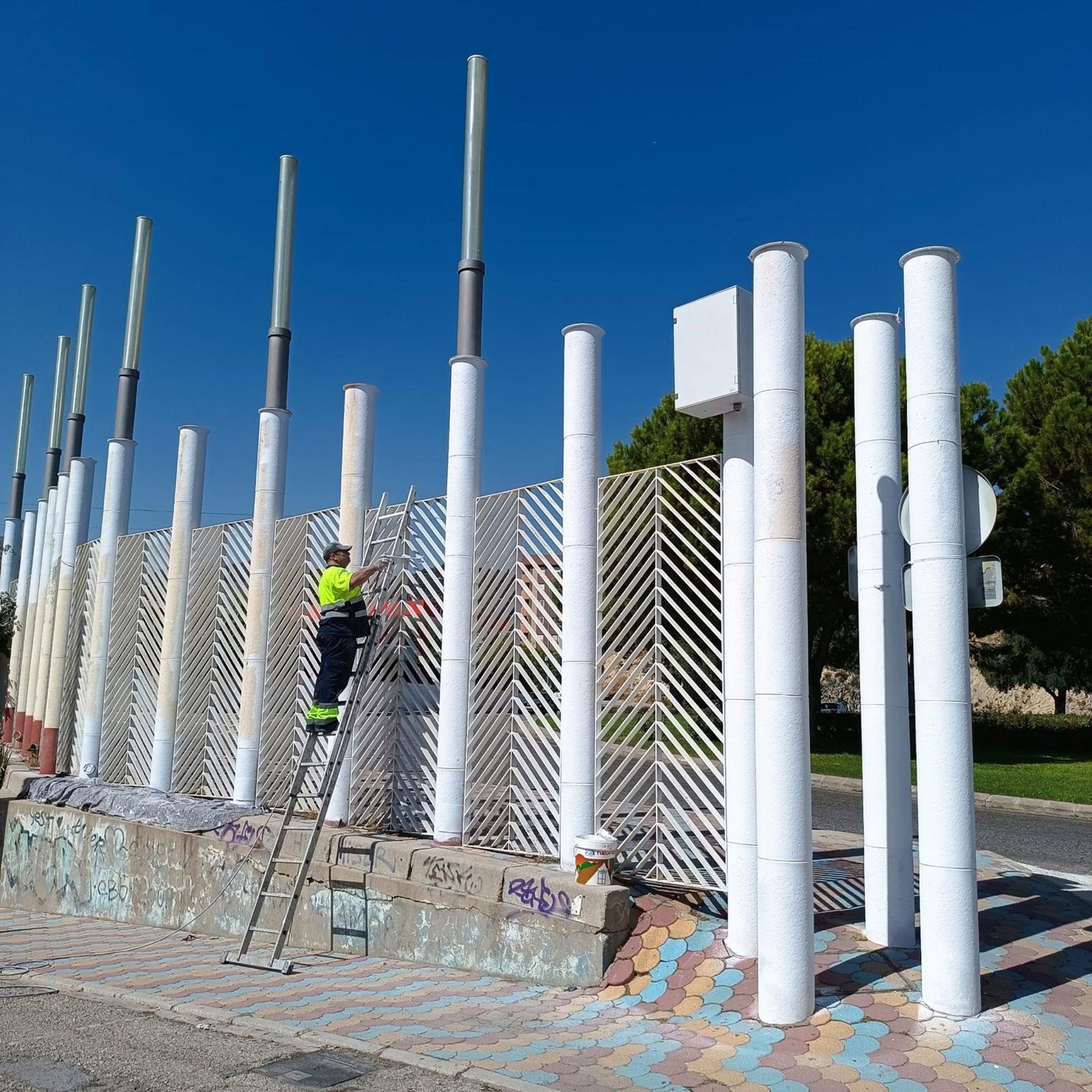 Por parte del área de pintura de la Concejalía de Conservación e Infraestructuras Municipales, señala el responsable del área, "se está cambiando la imagen de todo el perímetro del recinto. Para ello, se ha procedido a la renovación de la pintura de las columnas de color azul, cuya tonalidad se había desgastado y ofrecían una mala imagen del lugar".