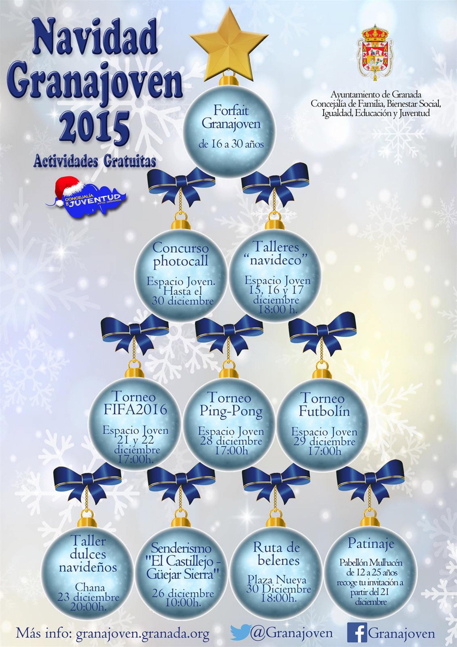 La Concejalía de Juventud del Ayuntamiento de Granada ha puesto en marcha una amplia oferta de actividades con carácter especial para el periodo de Navidad, en la que los jóvenes podrán disfrutar de salidas culturales, senderismo, cocina navideña, esquí en Sierra Nevada, patinaje, concursos, talleres de decoración navideña y torneos.