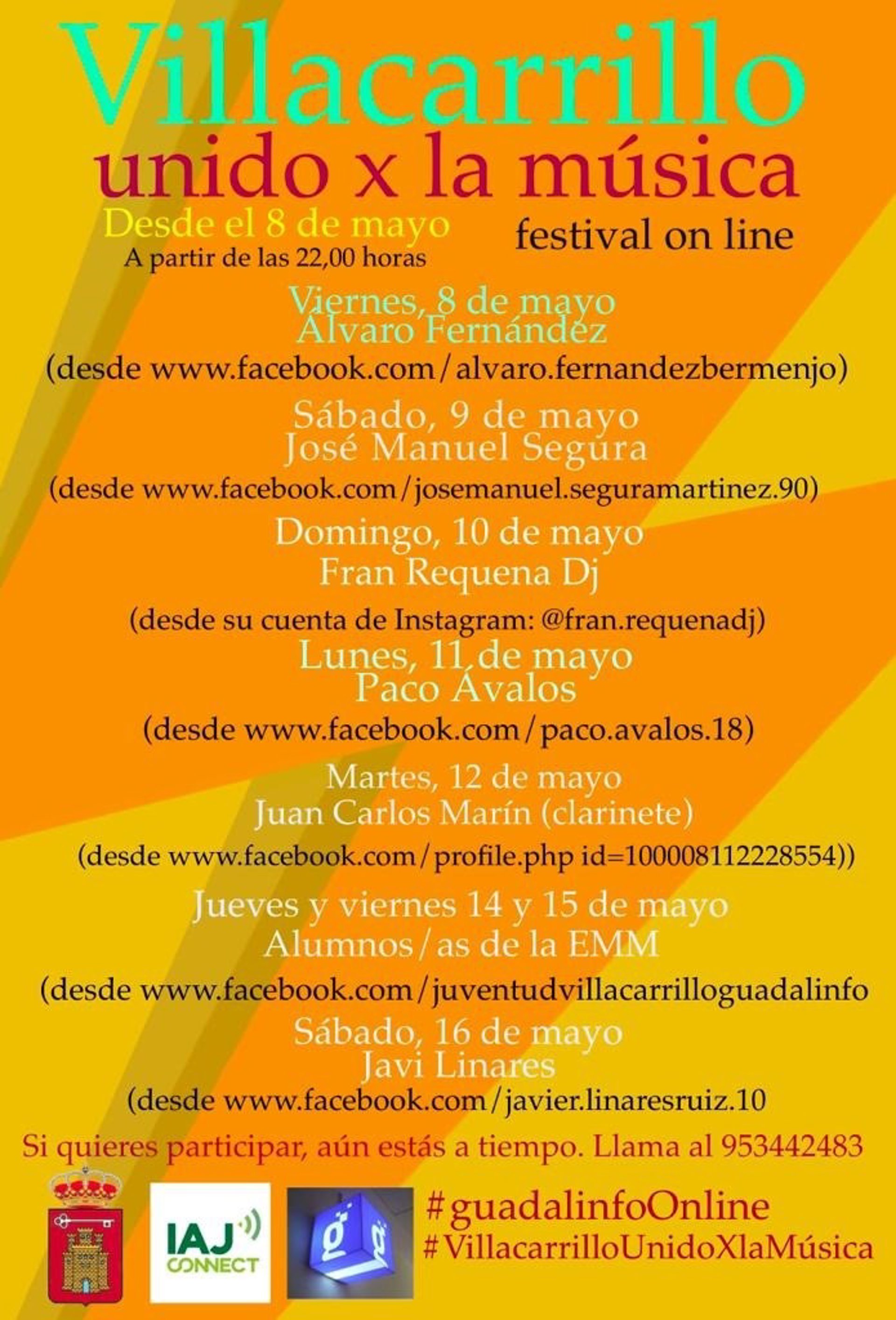 El Ayuntamiento de Villacarrillo (Jaén) ha impulsado la iniciativa 'Villacarrillo unido x la música', su primer festival de música 'online', que se ha puesto en marcha desde las Concejalías de Juventud y Cultura y que cuenta, además, con la colaboración del Instituto Andaluz de la Juventud y Guadalinfo.