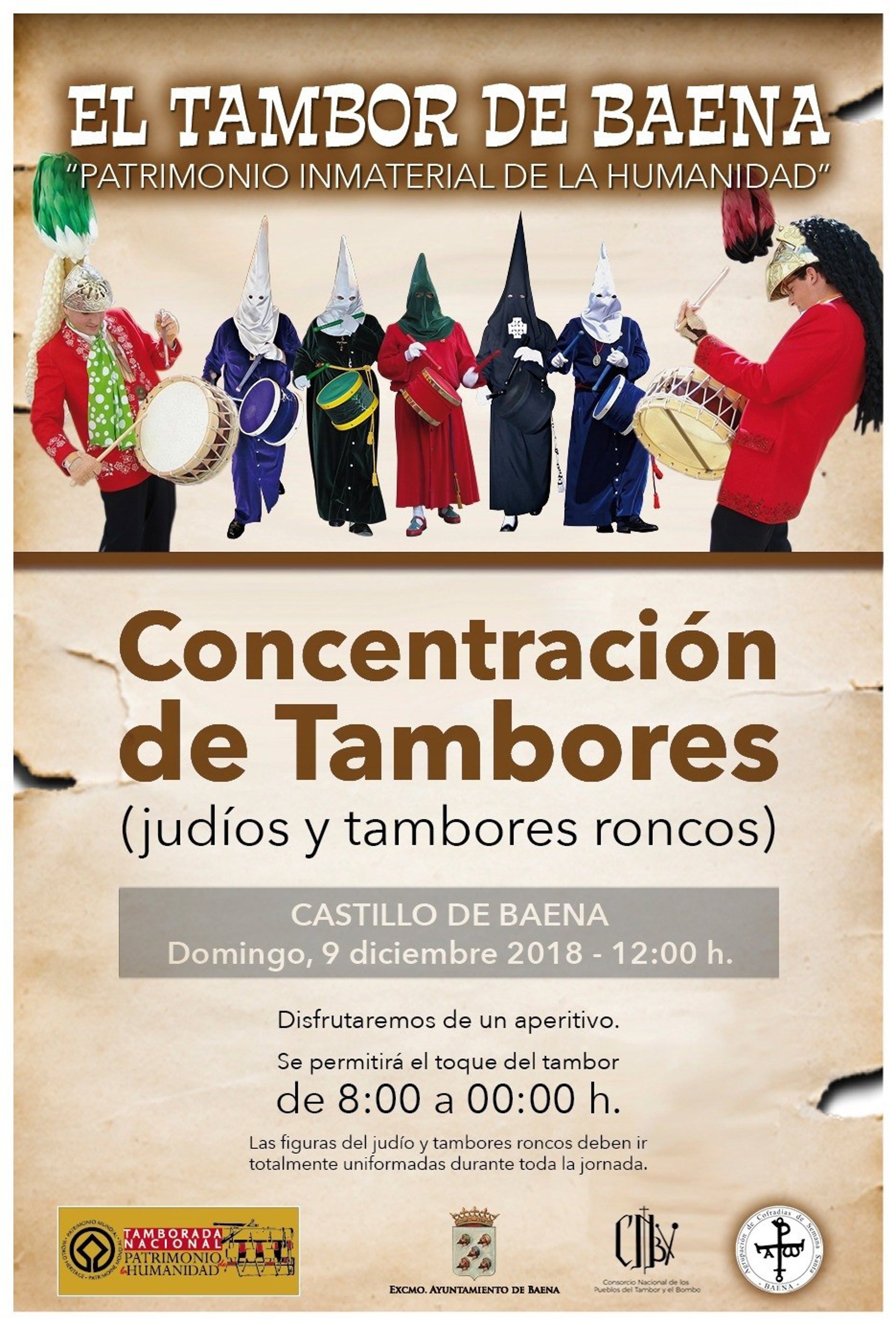 Según ha indicado el Ayuntamiento de Baena en una nota, junto a la Agrupación de Cofradías de Semana Santa y el Consorcio Nacional de los Pueblos del Tambor y el Bombo, se ha programado una concentración de tambores a partir de las 12,00 horas a la que están llamados los judíos colinegros y coliblancos y los hermanos de las cinco hermandades de tambores roncos.