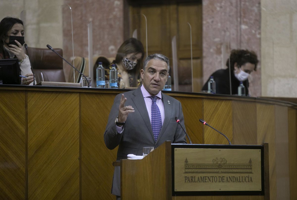 El consejero de la Presidencia, Administración Pública e Interior, Elías Bendodo, durante su comparecencia en el Pleno extraordinario del Parlamento andaluz. En Sevilla (Andalucía, España), a 21 de enero de 2021. - María José López - Europa Press