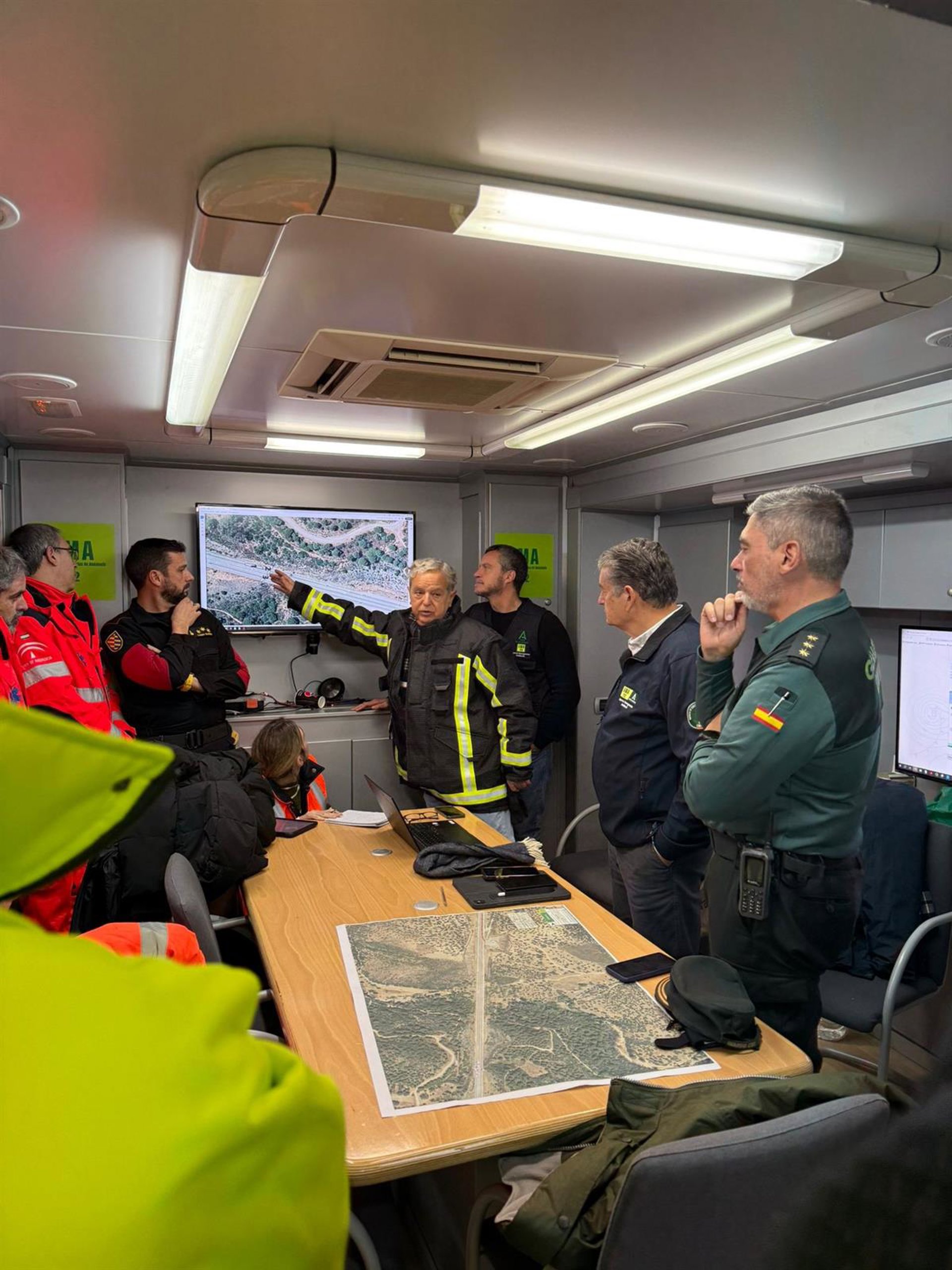 El presidente de la Diputación de Córdoba, Salvador Fuentes (centro), en la reunión de coordinación celebrada en el Puesto de Mando Avanzado desplegado por la Junta de Andalucía. - DIPUTACIÓN DE CÓRDOBA