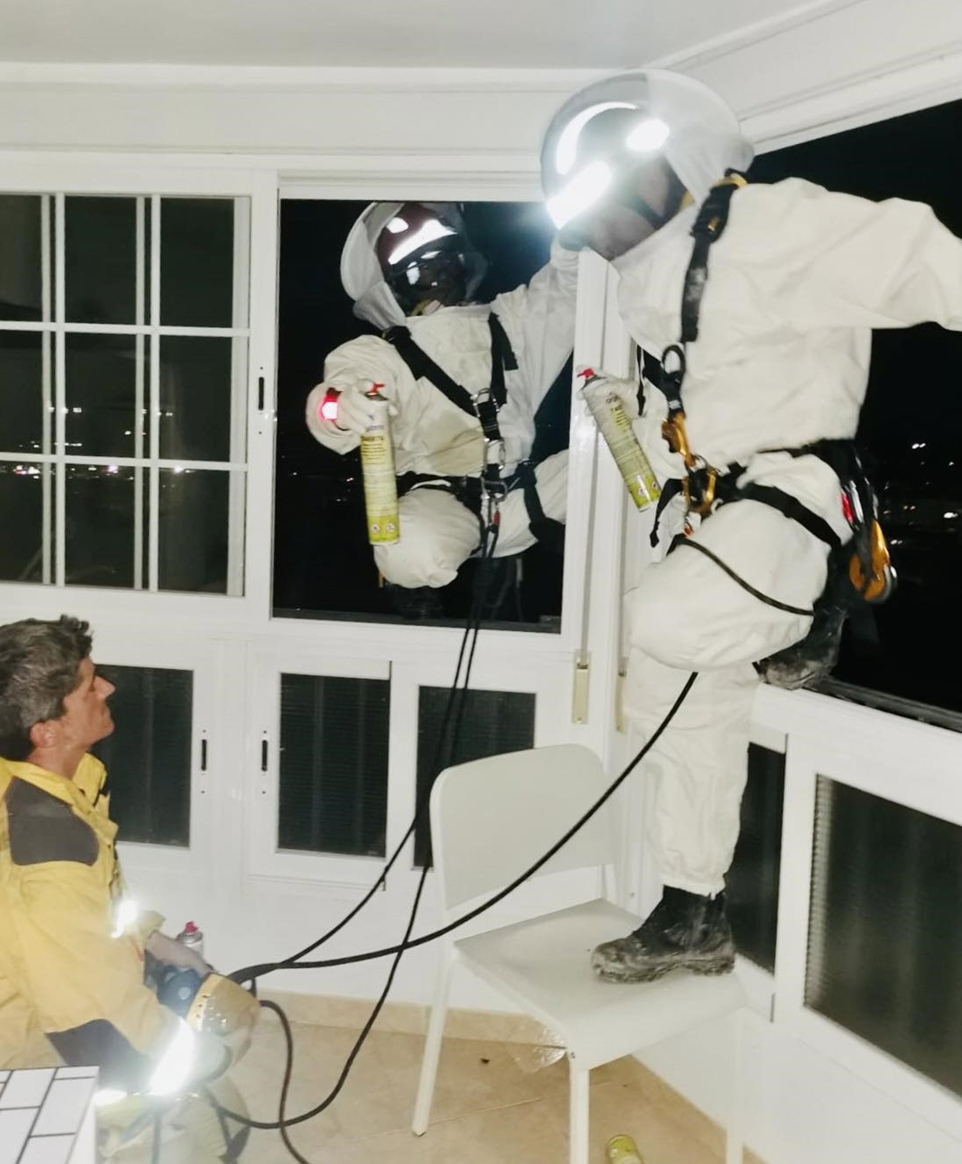 Los bomberos se desplazaron al lugar para identificarlo y confirmar que efectivamente se trataba de esta avispa invasora. Posteriormente, esa misma noche, se volvieron a personar en el edificio para, desde una cuarta planta, acceder al nido con las medidas de seguridad pertinentes y eliminarlo con un espray especial para este tipo de insectos.