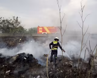 Fuentes de los bomberos han indicado que ha ardido un contenedor de neumáticos dentro de las instalaciones del Centro de Mantenimiento de Carreteras, lo que ha provocado que las llamas atravesaran la autovía y ardiera pasto que había en la cuneta. Aunque el fuego está extinguido, los efectivos continúan refrescando la zona.